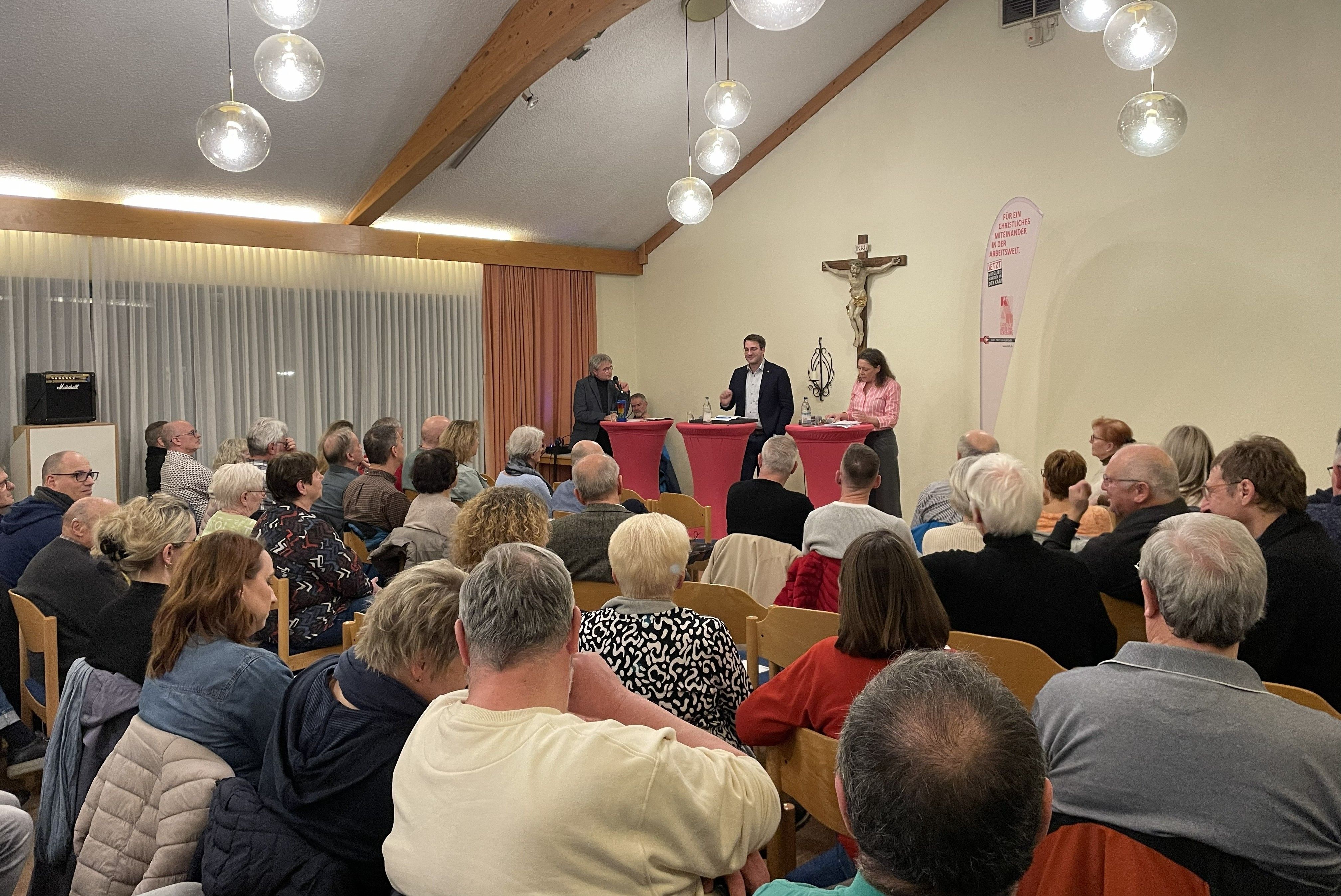 Noch wenige Wochen bis zur Kommunalwahl. Die KAB-Ortsverbände Hörstein und Wasserlos gingen ihrem Anspruch nach, sich kommunalpolitisch einzumischen und luden daher die drei Kandidierenden für das Bürgermeisteramt in Alzenau zu einer Podiumsdiskussion in das Pfarrheim Hörstein ein. Der aktuelle Amtsträger Stephan Noll von der CSU und die Kandidatin der SPD, Katrin Stutz-Engel folgten der Einladung und stellten sich den Fragen der KAB und rund 130 interessierten Bürgerinnen. Der Kandidat der Partei "Wir Bürger Alzenau" hatte seine Teilnahme im Vorfeld abgesagt.