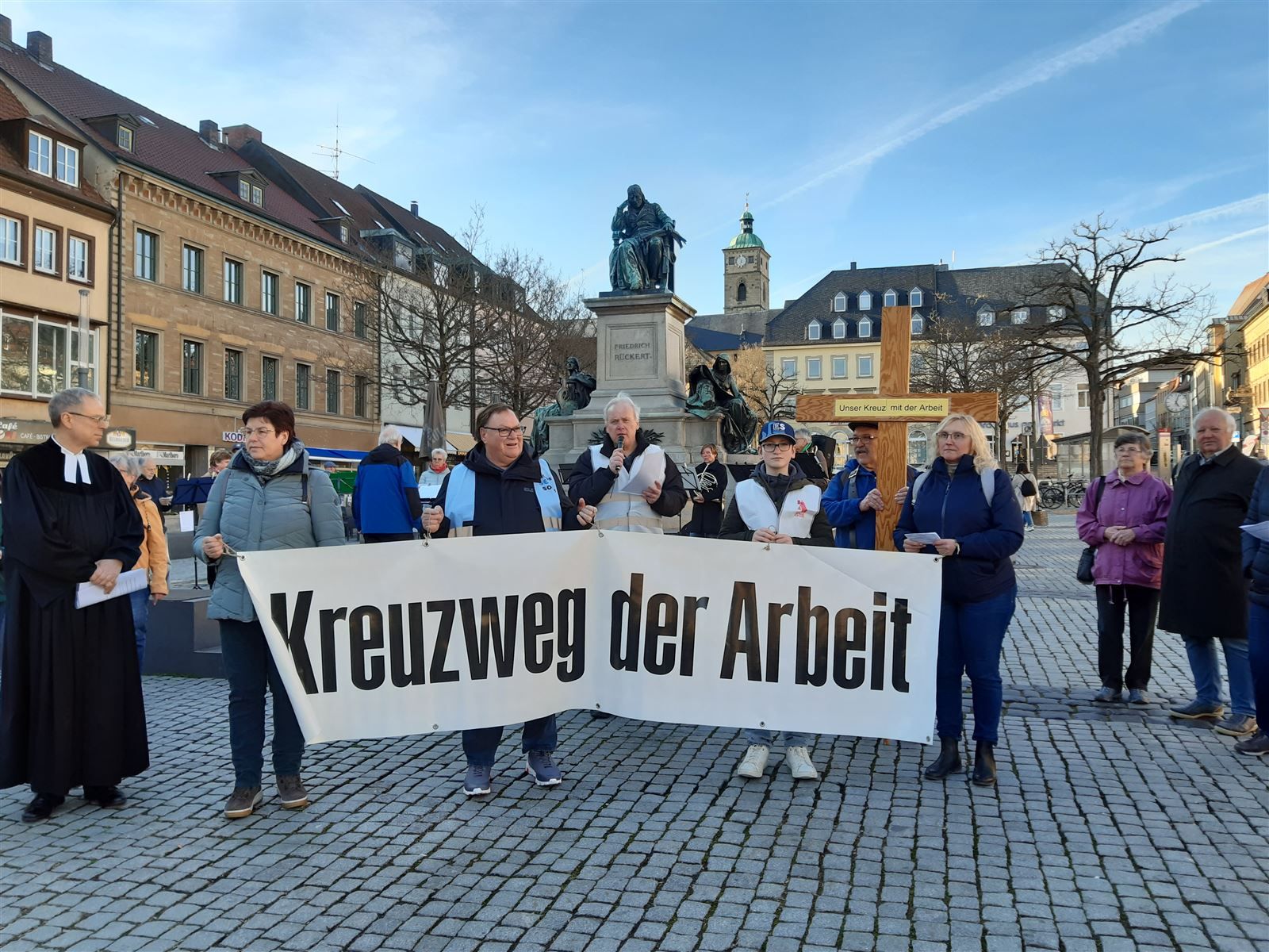 Arbeitnehmerinnen und Arbeitnehmer, evangelische und katholische Christinnen und Christen trafen sich am Montag in der Karwoche auf dem Marktplatz in Schweinfurt um gemeinsam unter Geleit der Schweinfurter Polizei durch Schweinfurts Straßen zu ziehen.
